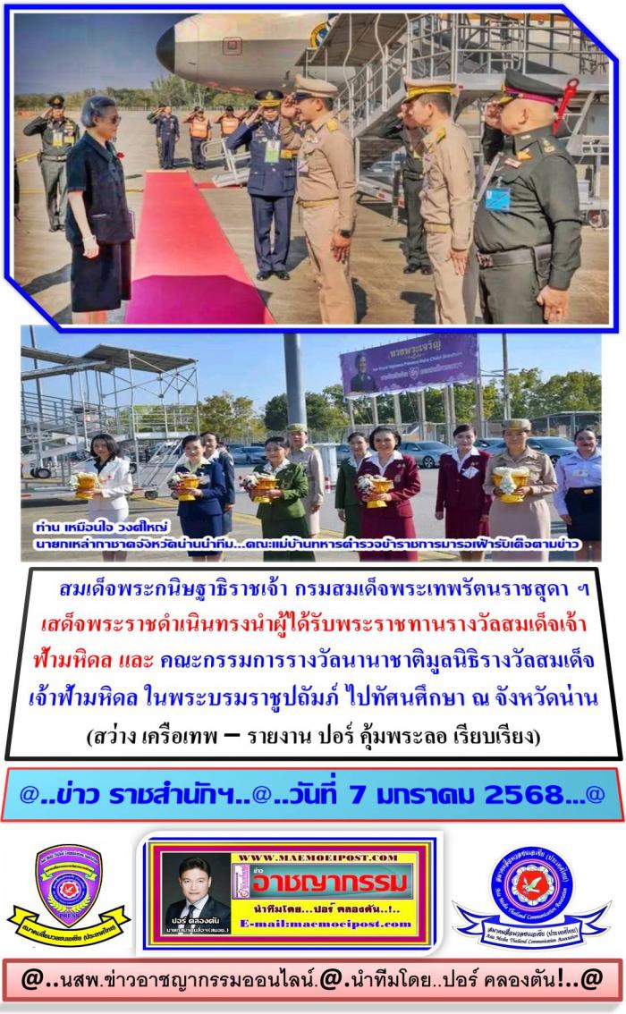 สมเด็จพระกนิษฐาธิราชเจ้า กรมสมเด็จพระเทพรัตนราชสุดา ฯ เสด็จพระราชดำเนินทรงนำผู้ได้รับพระราชทานรางวัลสมเด็จเจ้าฟ้ามหิดล และ คณะกรรมการรางวัลนานาชาติมูลนิธิรางวัลสมเด็จเจ้าฟ้ามหิดล ในพระบรมราชูปถัมภ์ ไปทัศนศึกษา ณ จังหวัดน่าน วันที่ 3 - 5 กุมภาพันธ์ 2569(เป