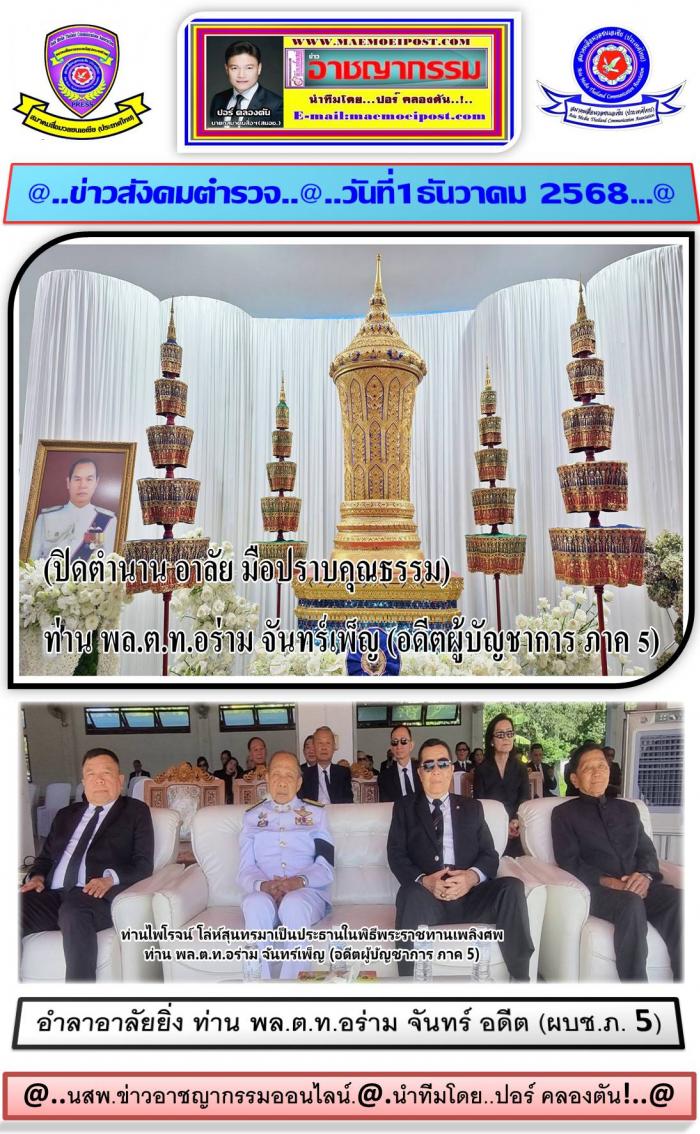 (ปิดตำนาน อาลัย มือปราบคุณธรรม)ท่าน พล.ต.ท.อร่าม จันทร์เพ็ญ (อดีตผู้บัญชาการ ภาค 5)โดยมี ท่านไพโรจน์ โล่สุนทร มาเป็นประธานในพิธีพระราชทานเพลิงศพ พร้อมด้วยท่านพล.ต.อ.ดร.ประสาน วงศ์ใหญ่ (อดีตผู้ช่วยผบ.ตร.)และท่านพล.ต.ท.สุเทพ เดชรักษา อดีต (ผบ.ภ.5) มาร่วมด้