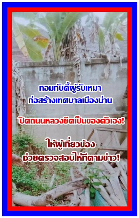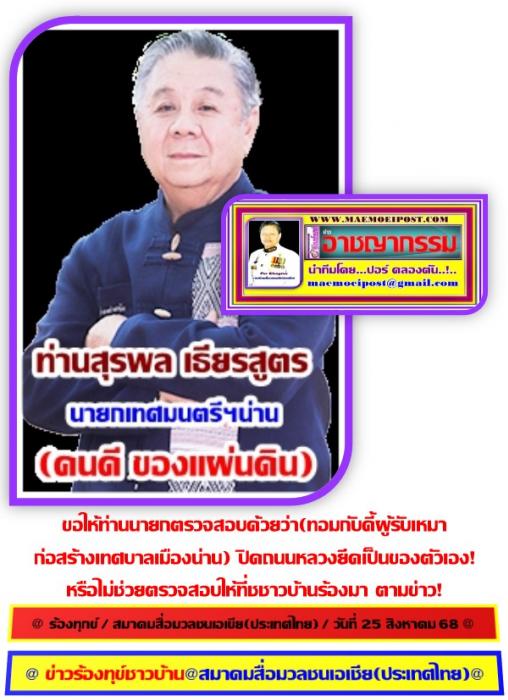 ช่วยชี้แจงให้ชาวบ้านหายสงสัยที และชาวช้านยังว่า (คนรวย ดี้กับทอมคู่นี้) เป็นผู้รับเหมางาน ในเทศบาลน่าน และเป็นผู้รับเหมางาน ชลประทานจ.น่าน ได้ยึดถนนหลวง ปิดทางชาวบ้านเดือดร้อนเป็นของตนเอง ทำให้ชาวบ้านไม่พอใจวอนให้ นายกสุรพล ส่งคนมาตรวจสอบด้วย ว่าตามที่ชาวบ้านร้องมาที่ สมาคมสื่อฯ นั้นจริงหรือเปล่า(ตามรูป) ช่วยชี้แจงให้ชาวบ้านตาสว่างด้วยตามข่าวและข่าวคืบหน้าจะนำมาเสนอต่อไป)