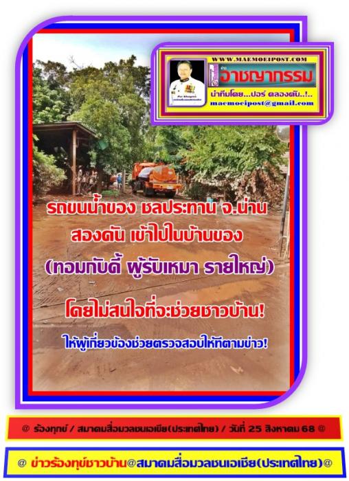 ที่ เทศบาลสายท่าลี่ ต.ในเมือง อ.เมือง จ.น่าน ผู้สื่อข่าว ศูนย์ข่าวภาคเหนือตอนบน ได้รายงานเข้ามาว่า เมื่อวันที่ 25 สิงหาคม 2568 ว่า คนเมืองน่านปลื้มใจขอขอบคุณผ่านทาง ผู้สื่อข่าวมาว่า ขอขอบคุณ ท่านร.อ. ธรรมนัส พรหมเผ่า ที่นำทีม รัฐมนตรีฯ ไปช่วยเหลือชาวบ้านในการ (ล้างถนนและล้างบริเวณบ้าน สถานที่ราชการ วัด จนดูสวยงามมาก) ขณะเดียวกันมีชาวบ้านส่งรูปมาฟ้องด้วยภาพว่ามี (รถชลประทานนำน้ำไปเต็มคันรถ) ชาวบ้านนึกว่าจะไปช่วยชาวบ้านที่แท้ ก็เอาไปล้างบ้าน (คนรวยดี้กับทอม) ที่สนิทแน่นกับท่าน นายกสุรพล เทศบาลเมืองน่าน! ทำให้ ชาวบ้านไม่พอใจ จึงขอให้ท่านชลประทาน จังหวัดและนายกเทศบาลเมืองน่าน