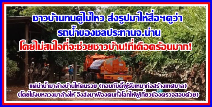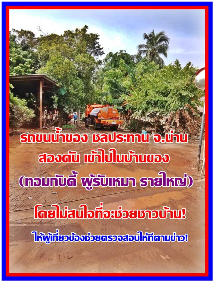คนเมืองน่านปลื้มใจขอขอบคุณ ท่านร.อ. ธรรมนัส พรหมเผ่า ที่นำทีม รัฐมนตรีไปช่วยเหลือชาวบ้านในการ (ล้างถนนและล้างบริเวณบ้าน จนดูสวยงามมาก) ขณะเดียวกันมีชาวบ้านส่งรูปมาฟ้องด้วยภาพว่ามี (รถชลประทานนำน้ำไปเต็มคันรถ) ชาวบ้านนึกว่าจะไปช่วยชาวบ้านที่แท้ เอาไปล้างบ้าน (คนรวยดี้กับทอม) ที่สนิทแน่นกับท่านนายกสุรพลเทศบาลเมืองน่าน! ทำให้ ชาวบ้านไม่พอใจ จึงขอให้ท่านชลประทาน จังหวัด และนายกเทศบาลเมืองน่านช่วยชี้แจงให้ทีตามข่าว