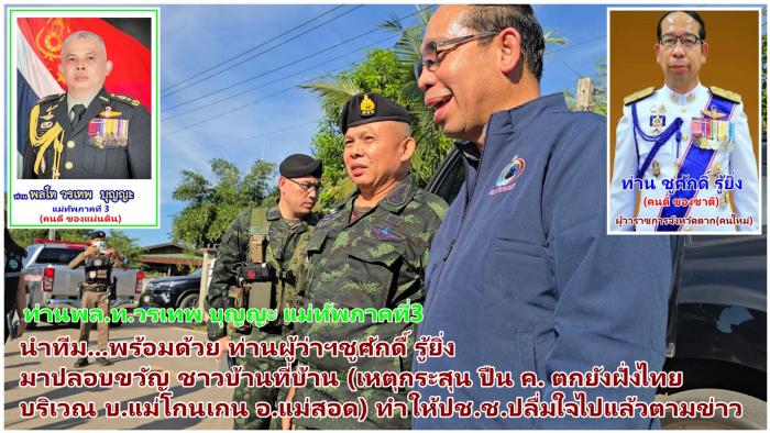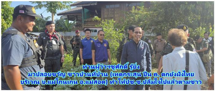 ท่านพล.ท.วรเทพ บุญญะ แม่ทัพภาคที่3 และ ท่านชูศักดิ์ รู้ยิ่ง ผู้ว่าราชการจังหวัดตาก ผู้ว่าฯตาก ลงพื้นที่เยี่ยม สร้างขวัญกำลังใจให้ประชาชนหลังเกิด(เหตุกระสุน ปืน ค. ตกยังฝั่งไทย บริเวณ บ.แม่โกนเกน อ.แม่สอด)