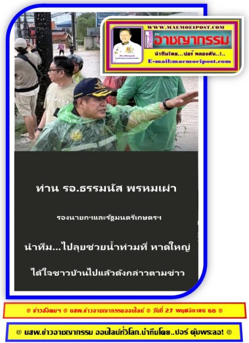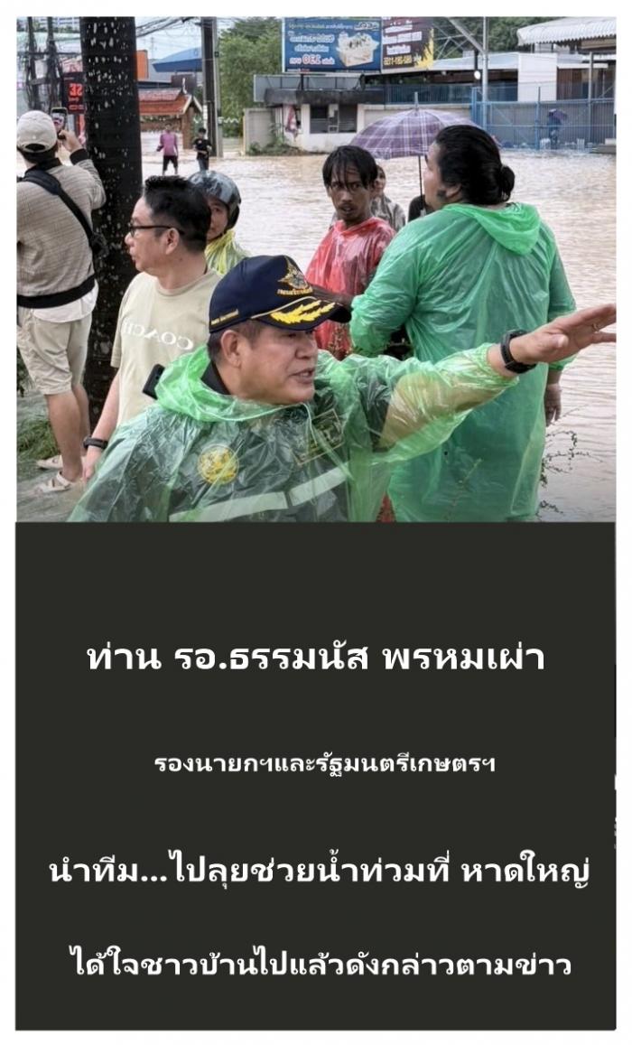 ที่ อำเภอหาดใหญ่ จ.สงขลา เมื่อ วันที่ 23 พ.ย. 2568 ผู้สื่อข่าวรายงานมาจากศูนย์ข่าวภาคใต้ว่า.. ท่าน ร.อ.ธรรมนัส พรหมเผ่า รองนายกรัฐมนตรี และรัฐมนตรีว่าการกระทรวงเกษตรและสหกรณ์ นำทีม...มูลนิธฯไปช่วยชาวบ้านอย่างจริงจังทำให้ชาวบ้านหาดใหญ่ได้ คลายความเครียดและได้ สั่งการให้องค์การตลาดเพื่อเกษตรกร (อ.ต.ก.) ระดมกำลังสนับสนุนการช่วยเหลือประชาชนผู้ประสบอุทกภัยในพื้นที่ภาคใต้ โดยเฉพาะอำเภอหาดใหญ่ จังหวัดสงขลา ซึ่งยังมีประชาชนจำนวนมากติดค้างและได้รับผลกระทบอย่างหนักจากสถานการณ์น้ำท่วมต่อเนื่องหลายวันดังกล่าวอย่างต่อเนื่องและ