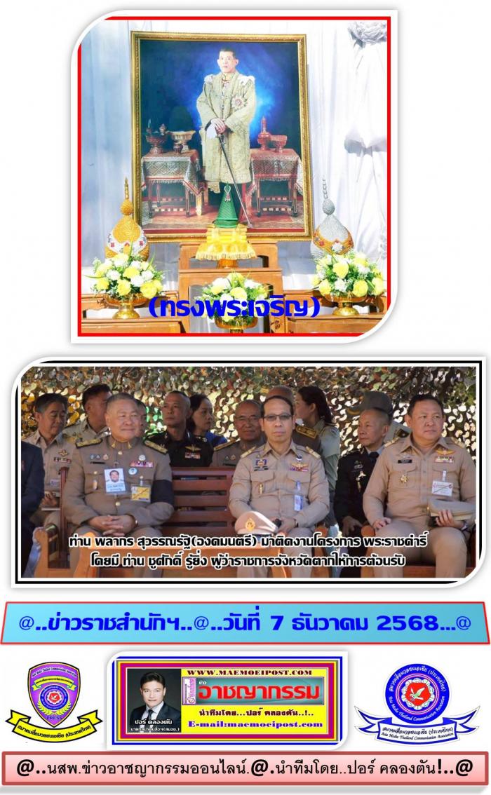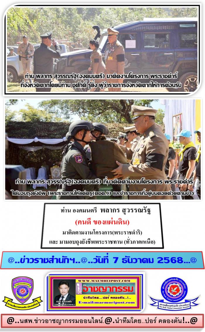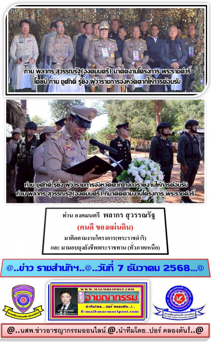ที่ท่าอากาศยานนานาชาติแม่สอด จังหวัดตาก เมื่อ วันที่ 3 ธ.ค. 68 เวลา 08.30 น.ผู้สื่อข่าวศูนย์ข่าวภาคเหนือ ตอนล่าง รายงานมาจากจังหวัดตากว่า... ท่าน ชูศักดิ์ รู้ยิ่ง ผู้ว่าราชการจังหวัดตาก ให้การต้อนรับ ท่านพลากร สุวรรณรัฐ องคมนตรี ประธานอนุกรรมการติดตามและขับเคลื่อนโครงการอันเนื่องมาจากพระราชดำริในพื้นที่ภาคเหนือ และคณะ ในโอกาสเดินทางมาติดตามและขับเคลื่อนโครงการอันเนื่องมาจากพระราชดําริในพื้นที่ภาคเหนือ เขตพื้นที่จังหวัดตาก พร้อมด้วยหน่วยงานที่เกี่ยวข้องร่วมให้การต้อบรับ