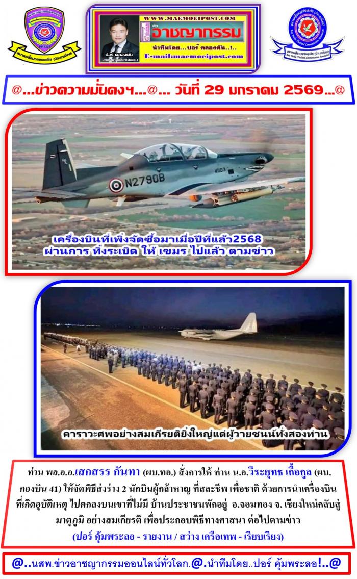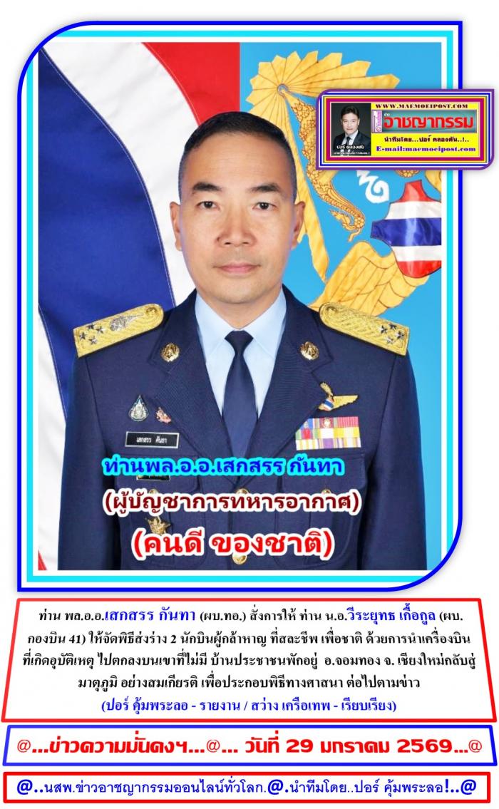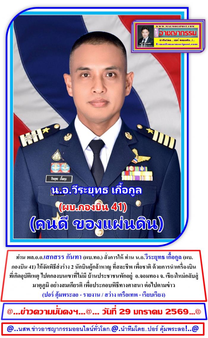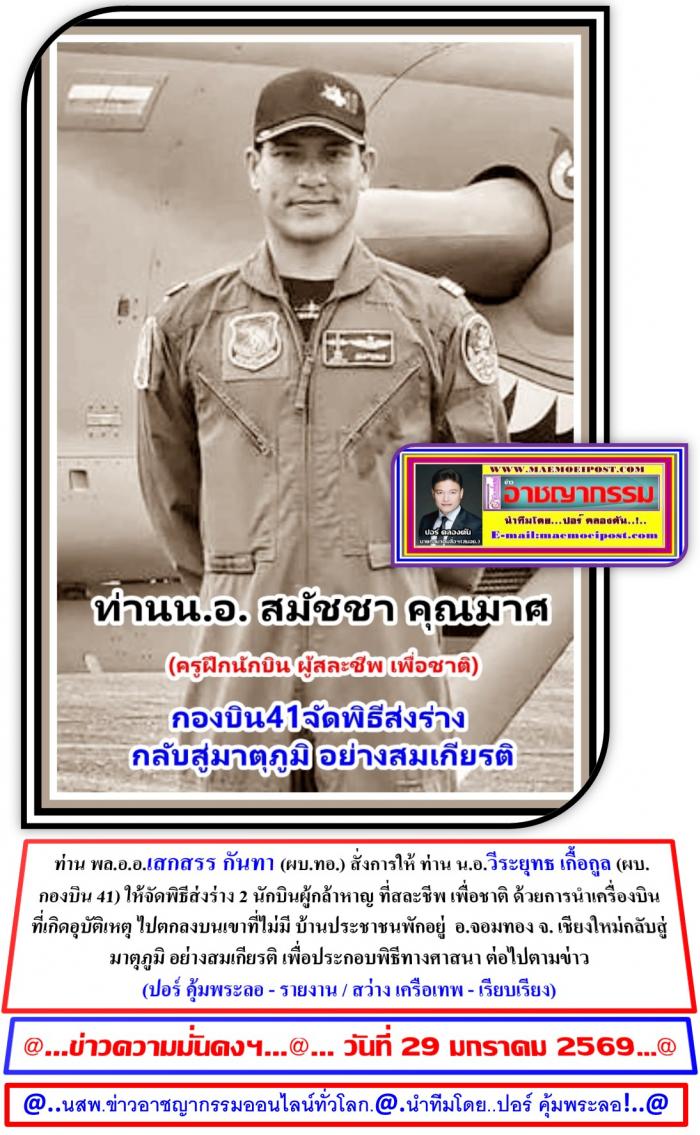 ที่ ท่าอากาศยานทหาร กองบิน 41 กองบิน 41 อ.เมือง จ.เชียงใหม่ ผู้สื่อข่าวได้รายงานเข้ามาว่าเมื่อ วันที่ 29 มกราคม 2569 ท่าน พล.อ.อ.เสกสรร กันทา (ผบ.ทอ.) สั่งการให้ ท่าน น.อ.วีระยุทธ เกื้อกูล (ผบ.กองบิน 41) ให้จัดพิธีส่งร่าง 2 นักบินผู้กล้าหาญ ที่สละชีพ เพื่อชาติ ด้วยการนำเครื่องบิน ที่เกิดอุบัติเหตุ ไปลงบนเขาที่ไม่มีบ้านประชาชน ที่อ.จอมทอง เชียงใหม่ กลับสู่มาตุภูมิ อย่างสมเกียรติ เพื่อประกอบพิธีทางศาสนาต่อไป