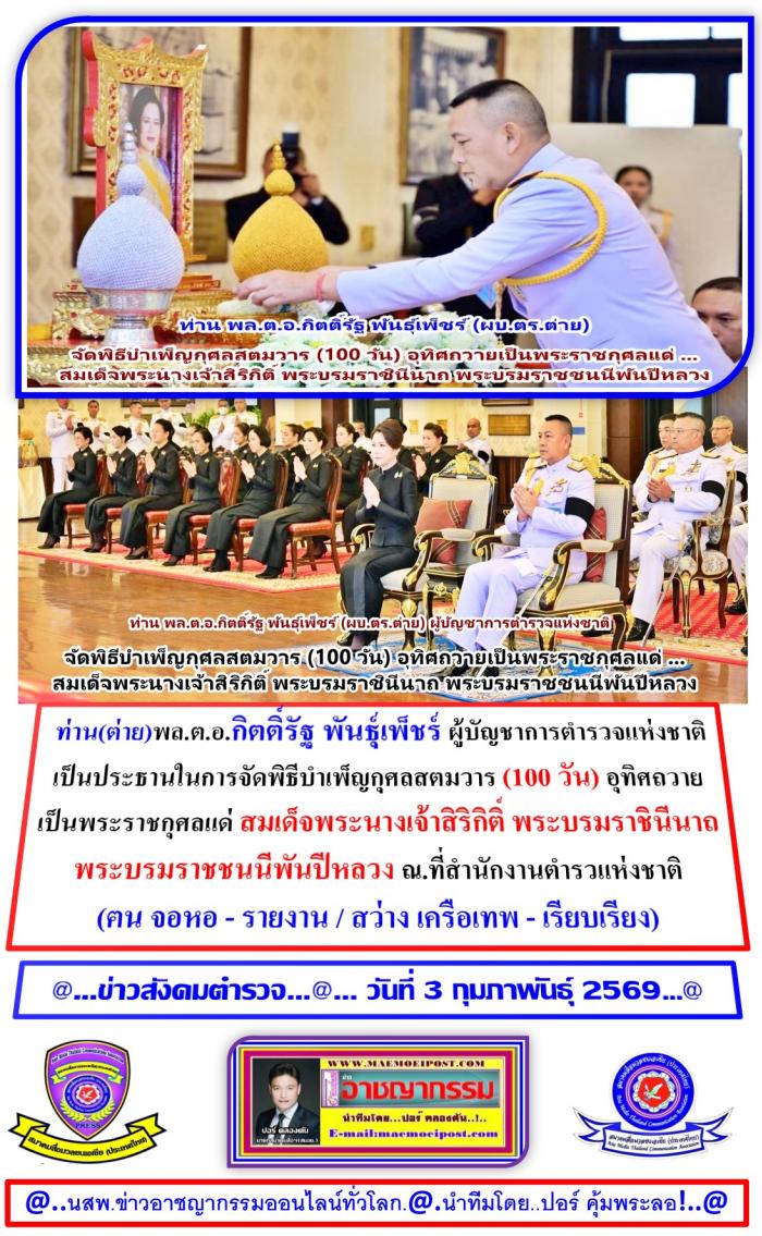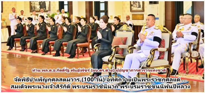 สำนักงานตำรวจแห่งชาติจัดพิธีบำเพ็ญกุศลสตมวาร (100 วัน) เพื่ออุทิศถวายเป็นพระราชกุศลแด่ สมเด็จพระนางเจ้าสิริกิติ์ พระบรมราชินีนาถ พระบรมราชชนนีพันปีหลวง โดยมี ท่าน พล.ต.อ.กิตติ์รัฐ พันธุ์เพ็ชร์ ผู้บัญชาการตำรวจแห่งชาติ (ผบ.ตร.) ประธานในพิธี พร้อมด้วย ท่าน กนกวรรณ พันธุ์เพ็ชร์ นายกสมาคมแม่บ้านตำรวจ / ท่านรอง ผบ.ตร. / ท่าน ผู้ช่วย ผบ.ตร. / รองจเรตำรวจแห่งชาติ / สื่อมวลชน / ข้าราชการตำรวจ และคณะสมาคมแม่บ้านตำรวจ ร่วมพิธี เพื่อถวายความอาลัยด้วยน้อมสำนึกในพระมหากรุณาธิคุณเป็นล้นพ้นอันหาที่สุดมิได้