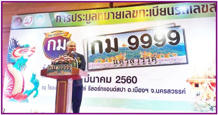 เมื่อวันที่ 4 มีค. 60 เวลา 9.00 น.ผู้สื่อข่าวรายงานเข้ามาว่าที่โรงแรมแกรนด์ฮิลล์ รีสอร์ท แอนด์ สปา จ.นครสวรรค์ ท่าน ธนาคม จงจิระ ผวจ นครสวรรค์ให้เกียรติกล่าวต้อนรับท่าน สนิท พรหมวงษ์ อธิบดีกรมการขนส่งทางบก มาเป็นประธานในพิธี นางสุจิตรา อินดนตรี ขนส่งจังหวัดนครสวรรค์ได้ทำการจัดให้มีการประมูลหมายเลขทะเบียนรถเลขสวย
