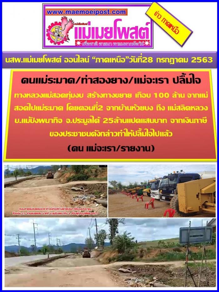 ที่แค็มป์สร้างทางสายแม่ระมาด-แม่สอด จ.ตาก เมื่อวันที่ 27 กรกฎาคม 2563ผู้สื่อข่าวรางานเข้ามาว่าได้รับการเปิดเผยจาก ท่าน ศิระ รัตนพงษ์ นายช่างโยธาควบคุมงานก่อสร้างถนนสายแม่สอด – แม่ระมาดระหว่าง(บ้านห้วยบง ถึง บ้านแม่สลิดหลวง)ระยะทางที่ทำนั้นหลายกิโลเมตรมีบริษัท แม่พนากิจ จำกัดโดยมีท่าน ชาญเดช กัลยาวัฒนเจริญ กรรมการผู้จัดการใหญ่ เป็นผู้ประมูลได้และได้ทำการก่อสร้างเพื่อให้แล้วเสร็จภายในเดือนกันยายน2563นี้เป็นเงินภาษีของประชาชนที่ใช้จ่ายครั้งนี้ (25 ล้าน 8 แสนบาท)โดยเร่งทำให้เสร็จตามกำหนดเพื่อ ให้ประชาชนชาวแม่ระมาดแม่จะเราใช้ในการสัญจรไปมาตามข่าวดังกล่าว(คน แม่จะเรา/รายงาน)นสพ.แม่เมยโพสต์ของคนภาคเหนือนำเสนอข่าวเข้าไปดูข่าวได้ที่...www.maemoeipost.com