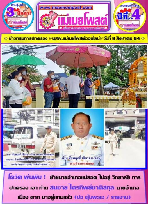 เด้งฝ้าผ่า โควิด พ่นพิษ ! ย้ายนายอำเภอแม่สอด ไปอยู่(วิทยาลัย กรมการปกครองเก็บกรุ ) เอา ท่าน สมชาย ไตรทิพย์ชาติสกุล นายอำเภอเมืองตาก มาอยู่แทนแล้ว ตามข่าว