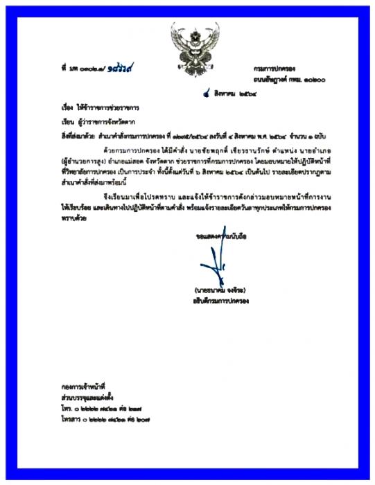 ที่กรมการปกครอง กทม. เมื่อวันที่ 5 ส.ค.2564 ท่าน ธนาคม จงจิระ อธิบดีกรมการปกครอง ได้ลงนามเซ็นต์คำสั่งแต่งตั้ง ในหนังสือที่ (มท 0302.1/186ว9) แจ้งมาที่ จังหวัดตาก ระบุในคำสั่งที่ (1285/2564) ลงวันที่ 4 สิงหาคม2564 ให้ท่าน ชัยพฤกติ์ เชียรธานรักษ์ นายอำเภอแม่สอด จังหวัดตาก ไปช่วยราชการที่กรมการปกครอง โดยมอบหมายให้ไปทำหน้าที่ ใน (วิทยาลัยการปกครอง เป็นการประจำ) ตั้งแต่วันที่ 6 สิงหาคม 64 เป็นต้นไป ต่อมาคำสั่ง จากกรมการปกครองโดยอธิบดีกรมการปกครองได้แต่งตั้งให้ท่าน สมชาย ไตรทิพย์ชาติสกุล มาทำหน้าที่นายอำเภอแม่สอดแทนตามคำสั่งที่ (1887/2564) ลงวันที่ 5 สิงหาคม 2564 ให้ท่าน สมชาย ไตรทิพย์ชาติ ไปปฎิบัติหน้าที่ตั้งแต่วันที่ 6 สิงหาคม 5264 เลยและต่อมาท่านนายอำเภอคนใหม่ของแม่สอดก็มาทำพิธีไหว้เจ้าที่สิงศักดิ์สิทธิ์ในอำเภอแม่สอดเพื่อขอเข้ามาปฎิบัติหน้าที่เรียบร้อยไปแล้วตั้งแต่วันที่ 7 สิงหาคม 2564 ไปแล้วตามข่าวดังกล่าว (ปอ คุ้มพะลอ /รายงาน)นสพ.แม่เมยโพสต์ของคนภาคเหนือนำเสนอข่าวเข้าไปดูข่าวได้ที่....www.maemoepost.com