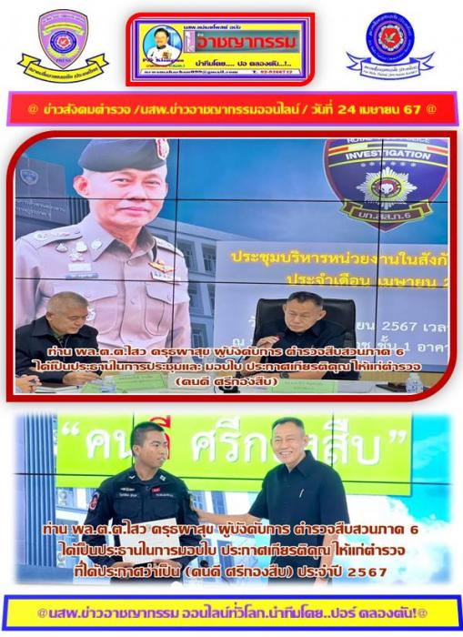 ที่ ห้องชินราช ชั้น 1 อาคาร บก.สส.ภ.6 อ.เมืองจ.พิษณุโลก ผู้สื่อข่าวรายงาน มาจากศูนย์ข่าวภาคเหนือ ตอนล่างเข้ามาว่า เมื่อวันที่ 21 เมษายน 2567 เข้ามาว่าท่าน พล.ต.ต.ไสว ครุธผาสุข ผบก.สส.ภ.6ได้เป็นประธานในการประชุมและ มอบใบ ประกาศเกียรติคุณ ให้แก่ตำรวจ (คนดี ศรีกองสืบ) ข้าราชการตำรวจในสังกัด บก.สส.ภ.6 ที่ปฏิบัติงานดีเด่น ทำงานเชิงรุก ช่วยเหลือประชาชนด้วยหัวใจ ตามโครงการ “คนดี ศรีกองสืบ”ประจำปี2567ของ ตำรวจสืบสวนภาค6ไปแล้ว