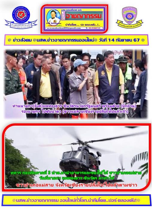 ร่วมกันกับ (ฝ่ายกรมป้องกันภัย นำ เฮลินคอปเตอร์ มาช่วยลำเรียงช่วยชาวบ้านดังกล่าวตามข่าว (ณัฐชา มหาชน – ได้รายงานสดมาจากสนามข่าว อำเภอแม่สาย เชียงราย ) นสพ. ข่าวอาชญากรรมออนไลน์ทั่วโลกนำเสนอข่าวเข้าไปดูข่าวได้ที่....www.maemoeipost.com