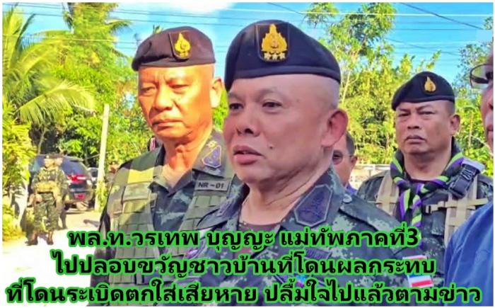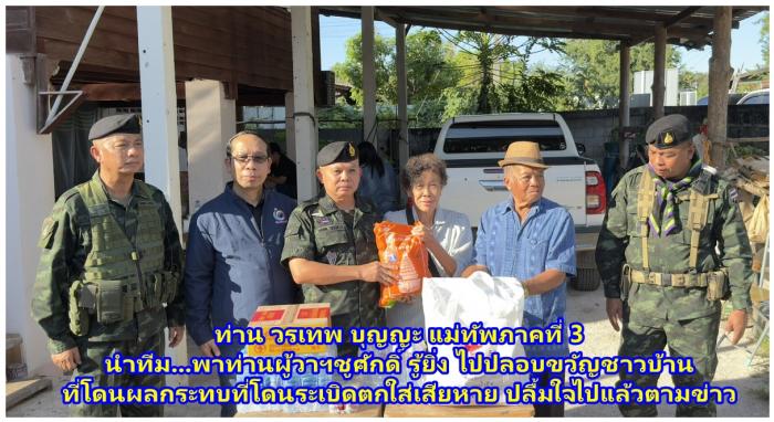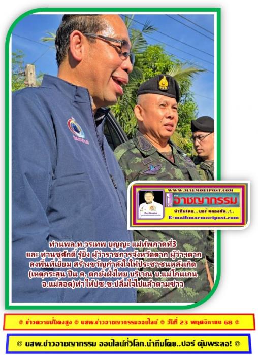 ที่บ้านแม่โกนเกน ต.มหาวัน อ.แม่สอด จ.ตาก เมื่อวันที่ 22 พ.ย. 68 เวลา 15.30 น. ผู้สื่อข่าวรายงานเข้ามาว่า...ท่าน พลโท วรเทพ บุญญะ แม่ทัพภาคที่ 3 และท่าน ชูศักดิ์ รู้ยิ่ง ผู้ว่าราชการจังหวัดตาก ลงพื้นที่เยี่ยมเยียนและสร้างขวัญกำลังใจให้ประชาชนที่ได้รับผลกระทบในพื้นที่ ม.4 ต.มหาวัน อ.แม่สอด จ.ตาก โดยได้...มอบถุงยังชีพจากสภากาชาดไทย จำนวน 5 หลังคาเรือน และตรวจเยี่ยมให้กำลังใจเจ้าหน้าที่ ผู้ปฏิบัติงานในการดูแลรักษาความสงบเรียบร้อยให้กับผู้หนีภัยความไม่สงบชาวเมียนมา (ผภสม.) ณ บริเวณพื้นที่ปลอดภัยชั่วคราวคอกวัวมหาวัน (เมยโค้ง) หลังเกิดเหตุกระสุน ปืน ค. (ไม่ทราบชนิด/ขนาด) มาตกยังฝั่งไทย บริเวณ บ.แม่โกนเกน ม.4 ต.มหาวัน อ.แม่สอด จ.ตาก จำนวน 1 นัด ส่งผลให้มีบ้านเรือนได้รับความเสียหาย จำนวน 4 หลังคาเรือน และรถยนต์ส่วนบุคคล จำนวน 1 คัน โดย แม่ทัพภาคที่ 3 พร้อม ผู้ว่าราชการจังหวัดตาก ได้เน้นย้ำการทำงานของเจ้าหน้าที่ทุกภาคส่วนให้ ทำงานอย่างเต็มที่ เพื่อความปลอดภัยของพี่น้องประชาชน และหากประชาชนมีข้อมูลข่าวสาร หรือความเดือดร้อน ท่านสามารถแจ้งกำนัน ผู้ใหญ่บ้าน เจ้าหน้าที่ทหาร ตำรวจ ในพื้นที่ของท่านได้ตลอด 24 ชั่วโมง