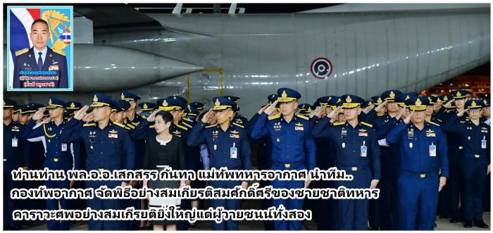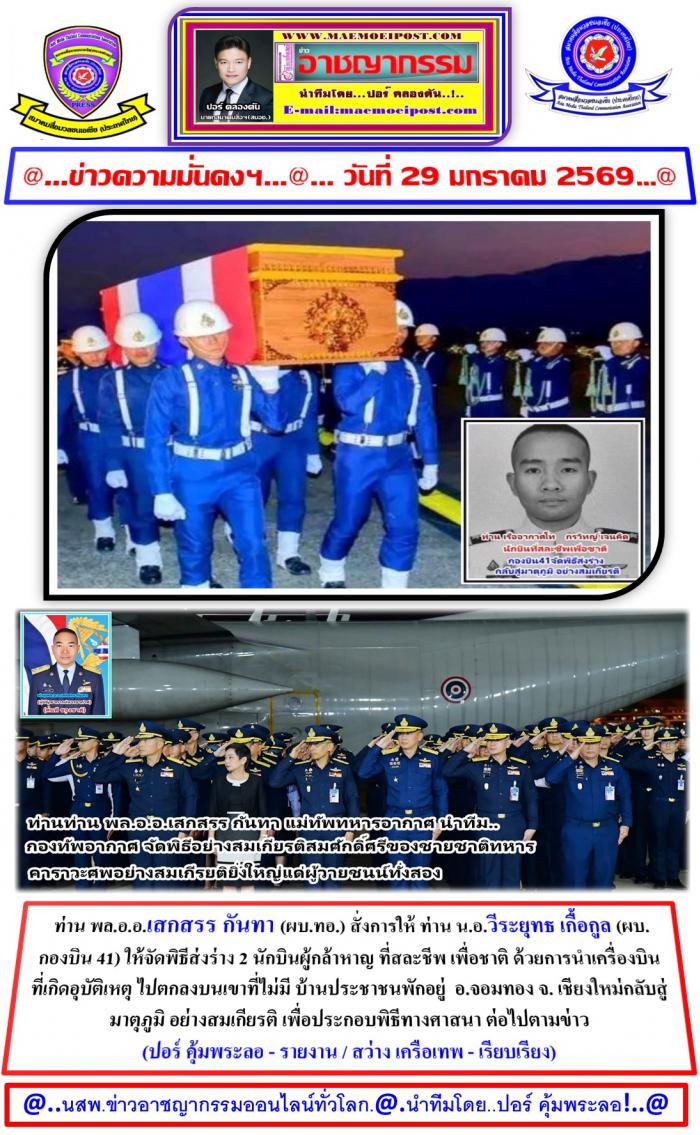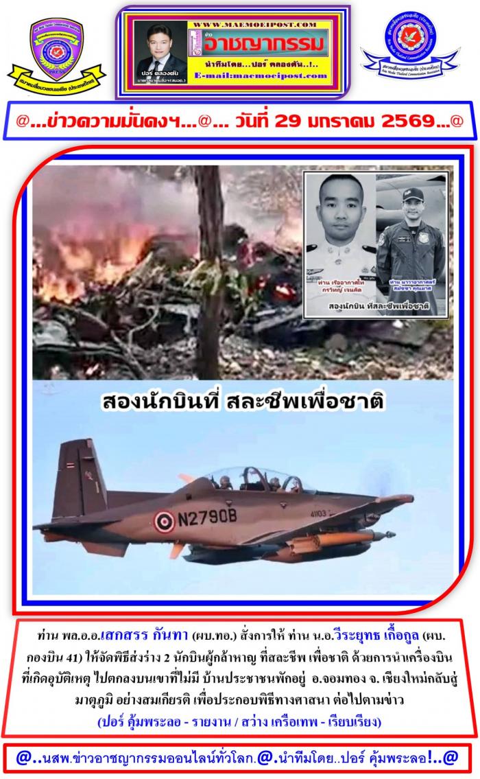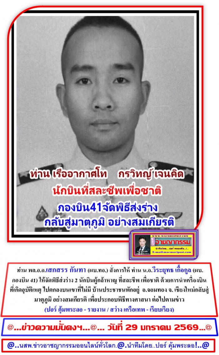 ที่ ท่าอากาศยานทหาร กองบิน 41 กองบิน 41 อ.เมือง จ.เชียงใหม่ ผู้สื่อข่าวได้รายงานเข้ามาว่าเมื่อ วันที่ 29 มกราคม 2569 ท่าน พล.อ.อ.เสกสรร กันทา (ผบ.ทอ.) สั่งการให้ ท่าน น.อ.วีระยุทธ เกื้อกูล (ผบ.กองบิน 41) ให้จัดพิธีส่งร่าง 2 นักบินผู้กล้าหาญ ที่สละชีพ เพื่อชาติ ด้วยการนำเครื่องบิน ที่เกิดอุบัติเหตุ ไปลงบนเขาที่ไม่มีบ้านประชาชน ที่อ.จอมทอง เชียงใหม่ กลับสู่มาตุภูมิ อย่างสมเกียรติ เพื่อประกอบพิธีทางศาสนาต่อไป