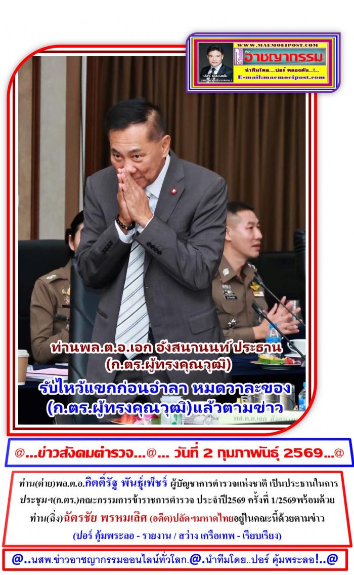 ที่ห้องประชุมฯห้องศรียานนท์ ชั้น 2 อาคาร 1 สนง.ตำรวจแห่งชาติ กทม. เมื่อวันที่ 28 มกราคม 2569 ผู้สื่อข่าว ประจำสนง.ตำรวจแห่ง ได้รายงานเข้ามาว่า ได้มีการประชุม (ก.ตร.ครั้งแรกของปี2569) ซึ่งมี ท่านพล.ต.อ.กิตติ์รัฐ พันธุ์เพ็ชร์ ผู้บัญชาการตำรวจแห่งชาติ ( ผบ.ตร. ) เป็นประธานการประชุม ก.ตร. ครั้งที่ 1/2569 โดยมี เลขาธิการ ก.พ. เลขาธิการ ก.พ.ร. ก.ตร.ผู้ทรงคุณวุฒิ รอง ผบ.ตร.และจเรตำรวจแห่งชาติ ร่วมประชุมโดยพร้อมเพรียงกัน ที่ห้องศรียานนท์ ชั้น 2 อาคาร 1 สำนักงานตำรวจแห่งชาติ เมื่อวันที่ 28 มกราคม 2569ภายหลังเสร็จสิ้นการประชุม ผบ.ตร. มอบของที่ระลึกให้แก่ พล.ต.อ.เอก อังสนานนท์ ก.ตร.ผู้ทรงคุณวุฒิ ในโอกาสที่จะพ้นจากตำแหน่งก่อนกำหนด เนื่องจากอายุครบ 70 ปี โดย ผบ.ตร. ได้กล่าวขอบคุณ พล.ต.อ.เอก ฯ ที่ได้ใช้ความรู้ความสามารถ โดยเฉพาะการบริหารงานบุคคล ช่วยเหลือกิจการของสำนักงานตำรวจแห่งชาติด้วยดีเสมอมา