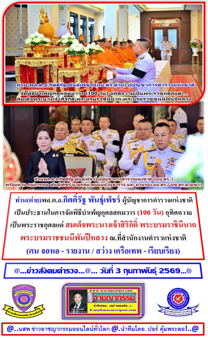 สำนักงานตำรวจแห่งชาติจัดพิธีบำเพ็ญกุศลสตมวาร (100 วัน) เพื่ออุทิศถวายเป็นพระราชกุศลแด่ สมเด็จพระนางเจ้าสิริกิติ์ พระบรมราชินีนาถ พระบรมราชชนนีพันปีหลวง โดยมี ท่าน พล.ต.อ.กิตติ์รัฐ พันธุ์เพ็ชร์ ผู้บัญชาการตำรวจแห่งชาติ (ผบ.ตร.) ประธานในพิธี พร้อมด้วย ท่าน กนกวรรณ พันธุ์เพ็ชร์ นายกสมาคมแม่บ้านตำรวจ / ท่านรอง ผบ.ตร. / ท่าน ผู้ช่วย ผบ.ตร. / รองจเรตำรวจแห่งชาติ / สื่อมวลชน / ข้าราชการตำรวจ และคณะสมาคมแม่บ้านตำรวจ ร่วมพิธี เพื่อถวายความอาลัยด้วยน้อมสำนึกในพระมหากรุณาธิคุณเป็นล้นพ้นอันหาที่สุดมิได้