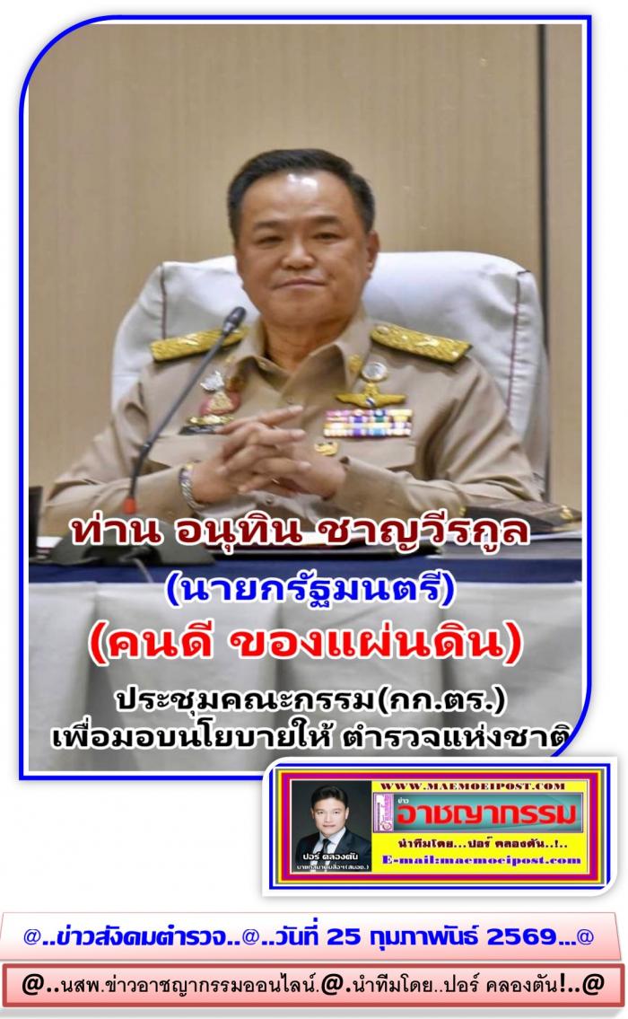 ผู้สื่อข่าวประจำ สำนักงานตำรวจแห่งชาติ ได้รายงานเข้ามาว่า ท่าน อนุทิน ชาญวีรกูล นายกรัฐมนตรี และรัฐมนตรีว่าการกระทรวงมหาดไทย ได้มา เป็นประธานในการประชุมคณะกรรมการนโยบายตำรวจแห่งชาติ หรือ ( ก.ต.ช. ครั้งที่ 1 / 2569 ) โดยมี (ท่าน ต่าย) พล.ต.อ.กิตติ์รัฐ พันธุ์เพ็ชร์ ผู้บัญชาการตำรวจแห่งชาติ และคณะกรรมการฯ (กตช.)ร่วมประชุมเต็มห้องประชุม ณ.ที่ห้องประชุมศรียานนท์ สำนักงานตำรวจแห่งชาติ ปทุมวัน กทม. เมื่อวันที่ 25 กุมภาพันธ์ 2569ดังกล่าวตามข่าว (สว่าง มหาชน - รายงาน / ภาพข่าว จาก...PR.สำนักงานตร. / ปอร์ คุ้มพระลอ -นำเสนอข่าว)เข้าไปดูข่าวได้ที่...www.maemoeipos.com